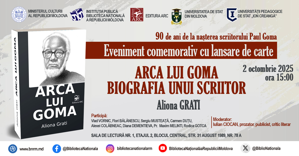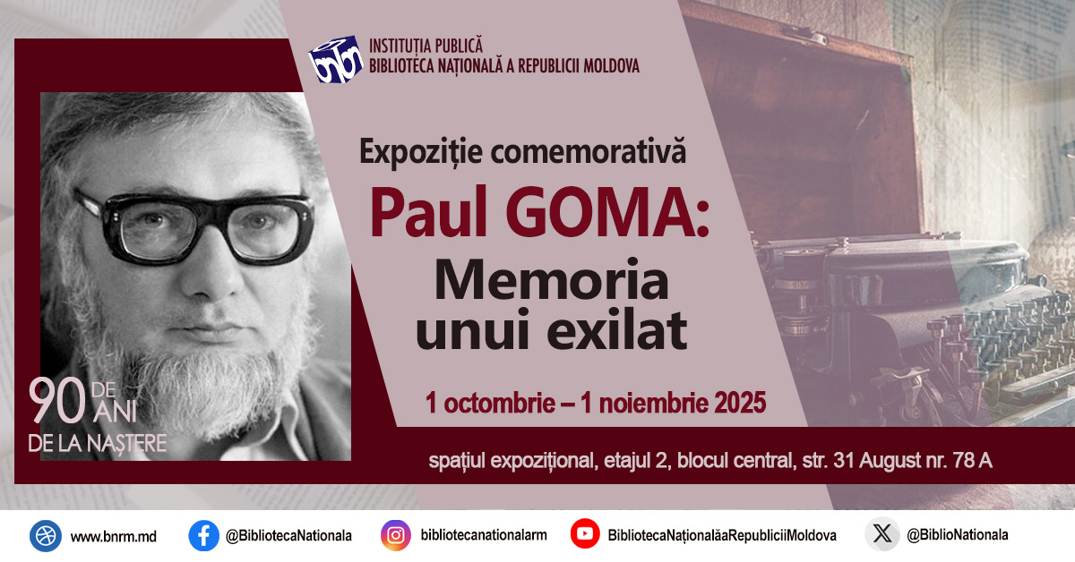 Biblioteca Națională a Republicii Moldova organizează expoziția comemorativă cu genericul „Paul Goma: Memoria unui exil. 90 de ani de la naștere”. Expoziția dedicată celor 90 de ani de la nașterea scriitorului Paul Goma este un omagiu adus acestui prozator și disident anticomunist, originar din Basarabia – o personalitate nonconformistă atât în viață, cât și în creație, Doctor Honoris Causa al Academiei de Științe a Moldovei. Deși stabilit în exil, Paul Goma a scris exclusiv în limba română, însă operele sale au fost traduse și publicate în numeroase limbi, printre care franceza, germana, olandeza și suedeza. Paul Goma rămâne o conștiință a libertății, un model de demnitate și rezistență prin cuvânt. Viața și opera sa reprezintă pentru noi o lecție de curaj și adevăr, pe care suntem datori să o păstrăm și să o urmăm.