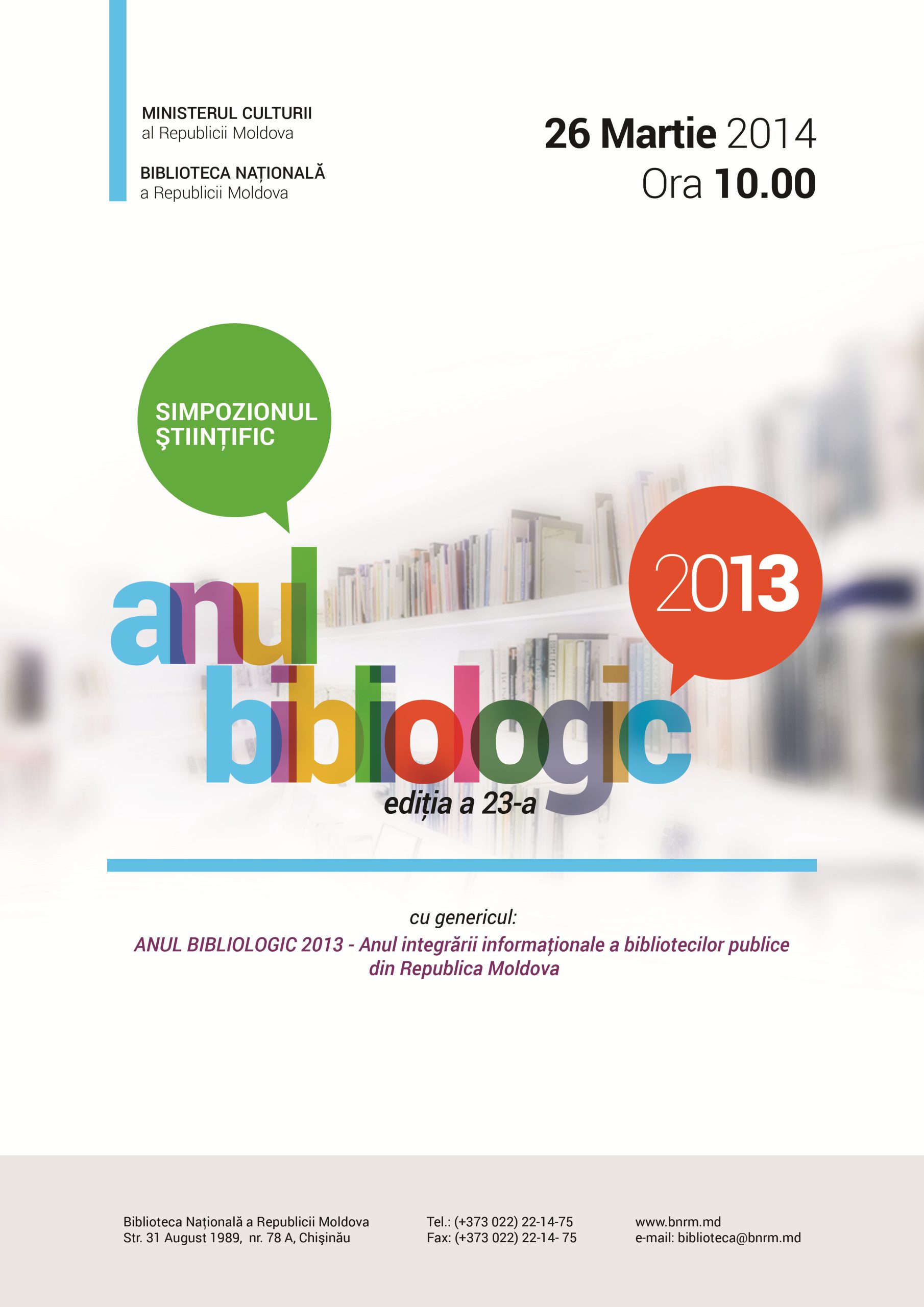 La 26 martie, cu începere de la ora 10.00, în sala de conferinţe a BNRM va avea loc simpozionul științific Anul Bibliologic 2013- Anul integrării informaţionale a bibliotecilor publice din Republica Moldova. Vezi afis și program.