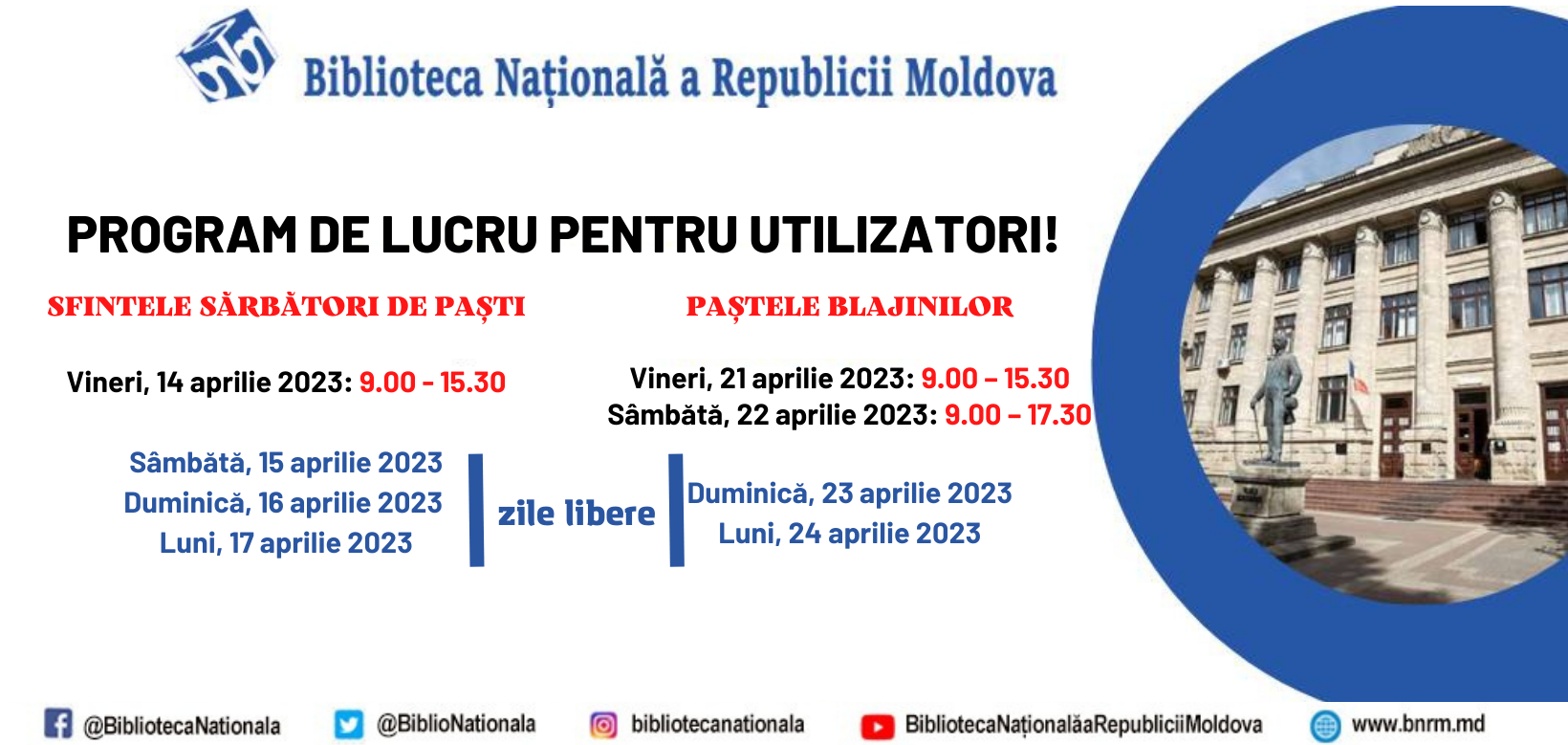 În perioada Sfintelor sărbători de Paști și Paștele Blajinilor, Biblioteca Națională a Republicii Moldova va activa conform programului: