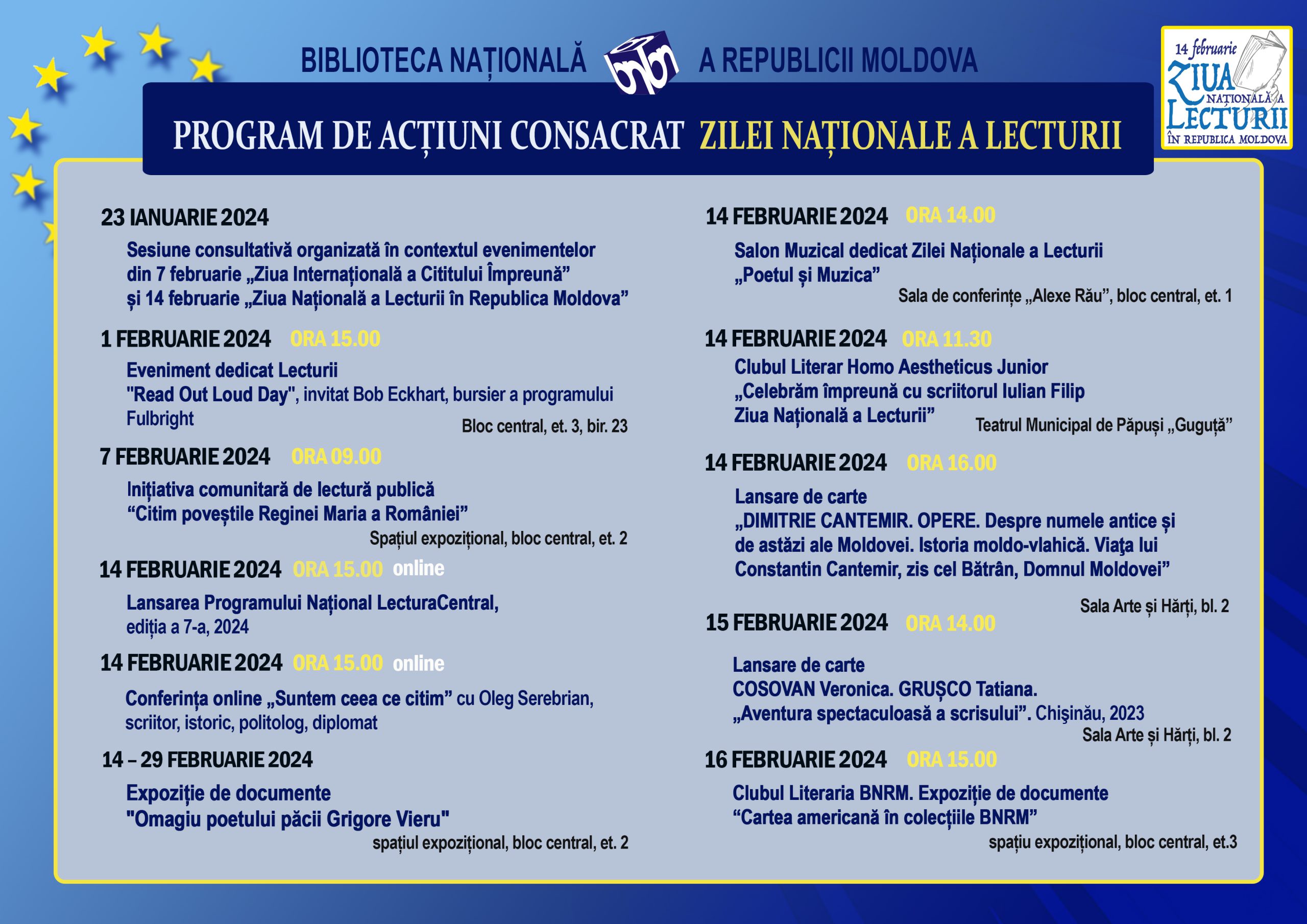 Cu prilejul Zilei Naționale a Lecturii și Zilei comemorării lui Grigore Vieru în Republica Moldova, Biblioteca Națională a Republicii Moldova invită publicul la o suită activități socio-culturale organizate cu scopul de a promova lectura, de a scoate în prim – planul vieții culturale lectura și importanța acesteia în dezvoltarea persoanelor și a societății.
