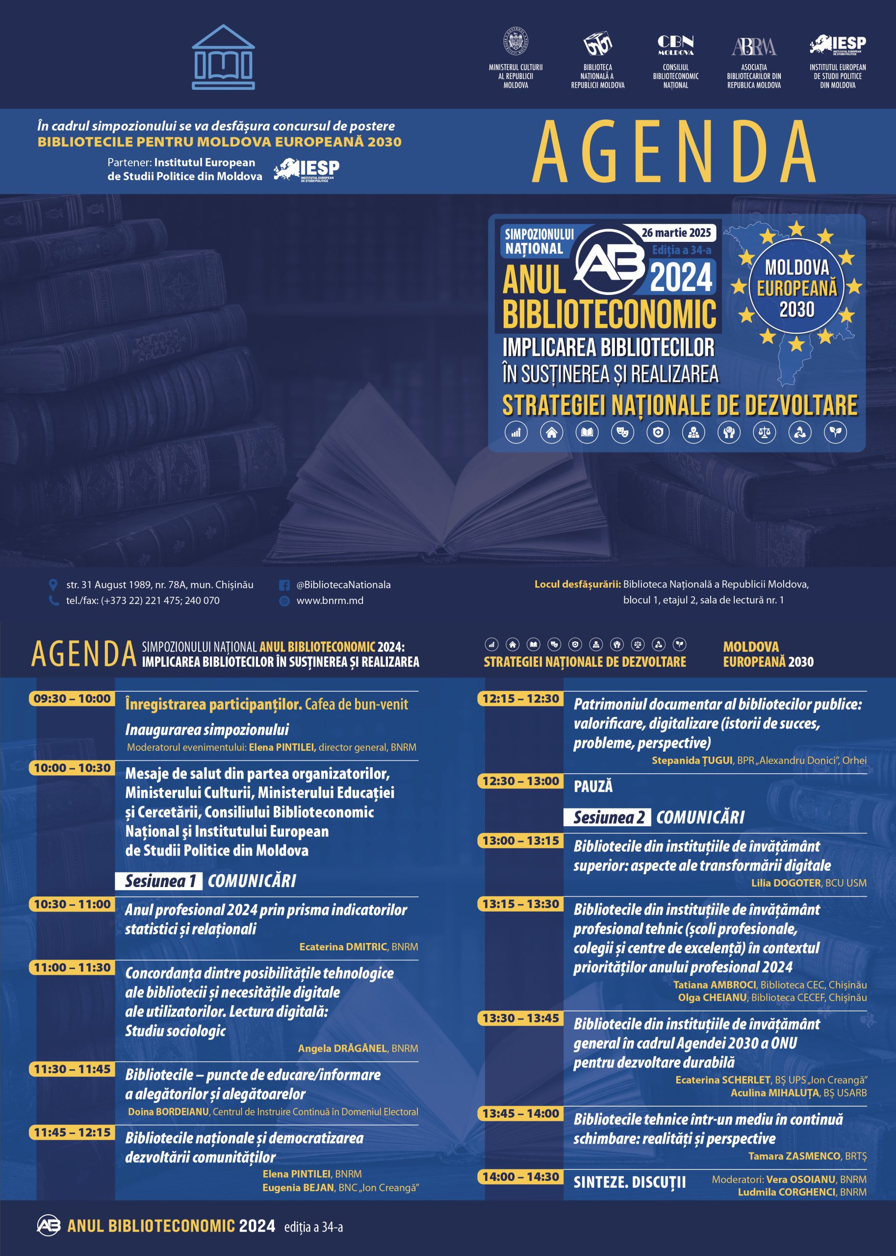 Biblioteca Națională a Republicii Moldova vă invită să participați la lucrările ediției a 34-a a Simpozionului Național „Anul Biblioteconomic 2024: Implicarea bibliotecilor în susținerea și realizarea Strategiei Naționale de Dezvoltare „Moldova Europeană 2030”.