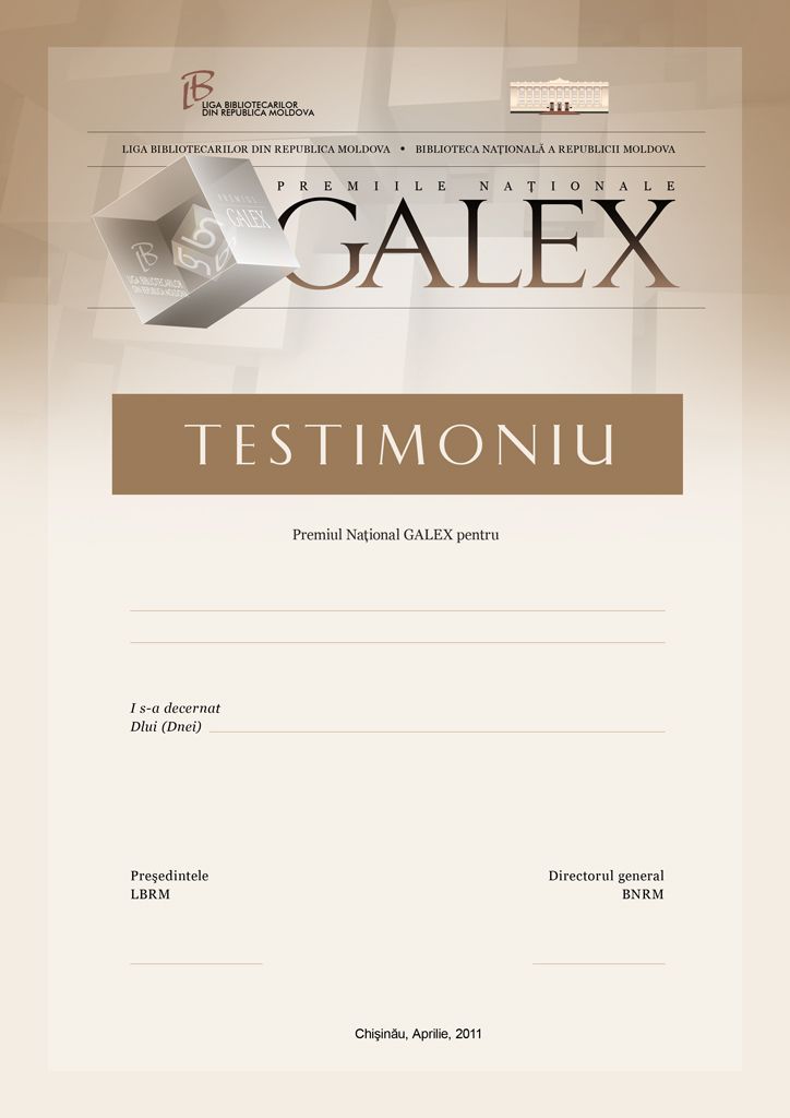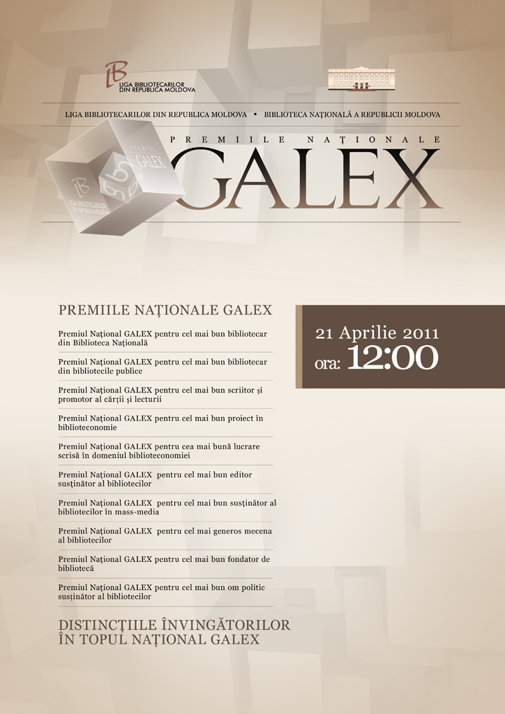 La 21 aprilie, cu începere de la ora 12.00, în sediul central al Bibliotecii Naţionale s-a desfăşurat, în premieră, festivitatea înmânării Premiilor Naţionale GALEX instituite de Liga Bibliotecarilor din Republica Moldova şi de BNRM. Vezi comunicatul de presă, Afiş, Testimoniu.