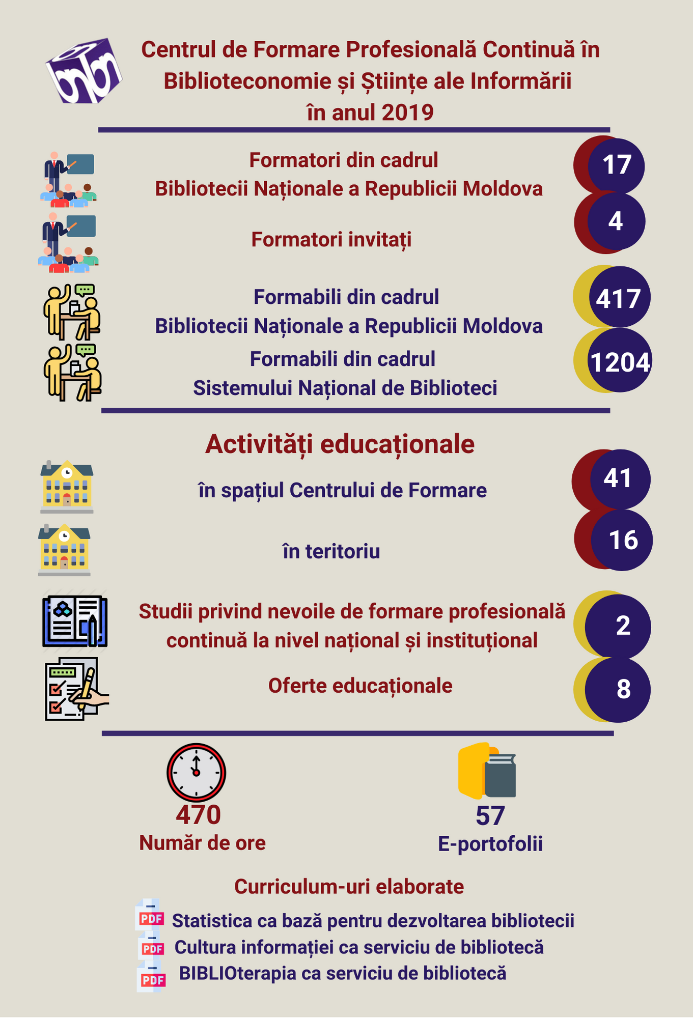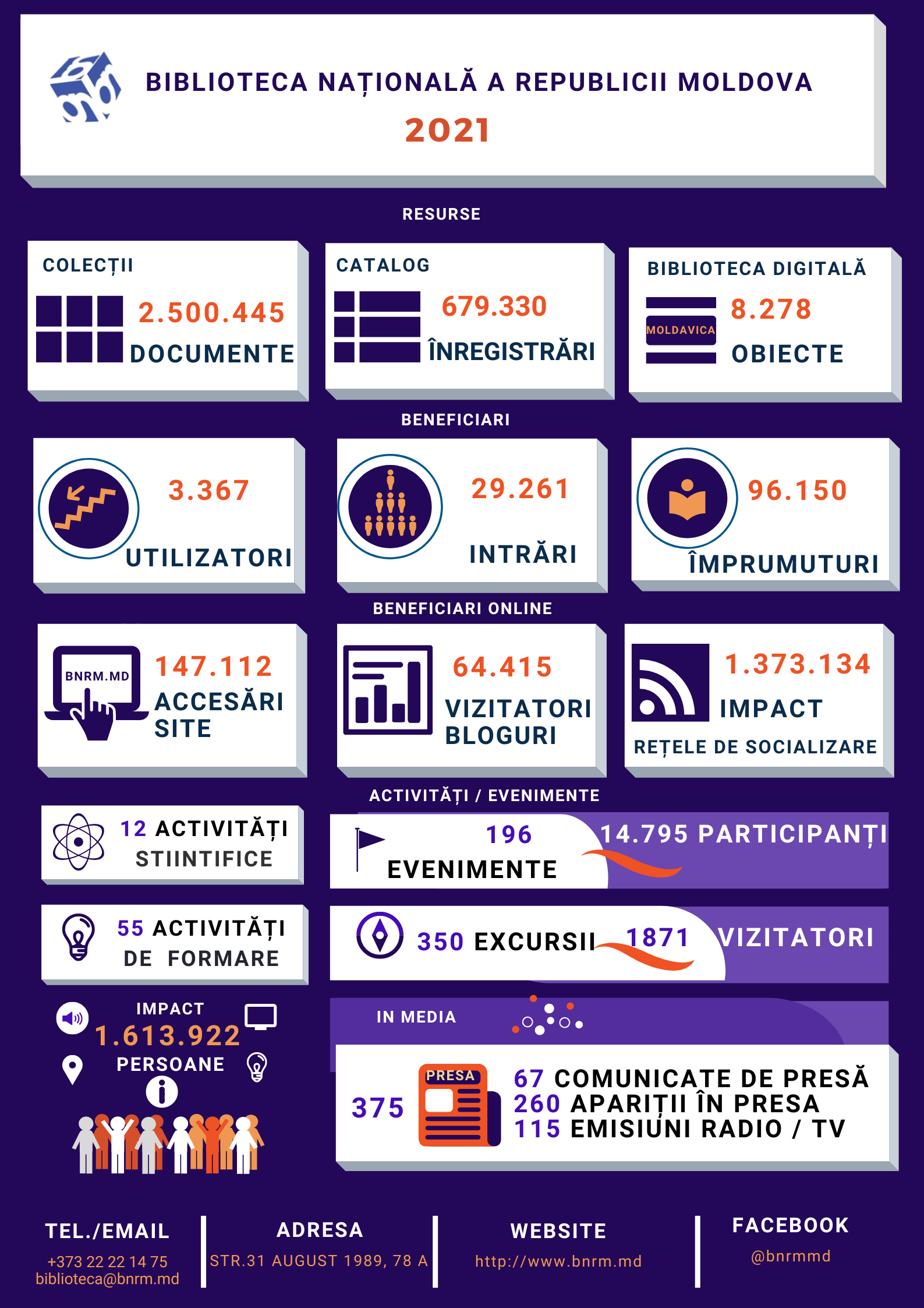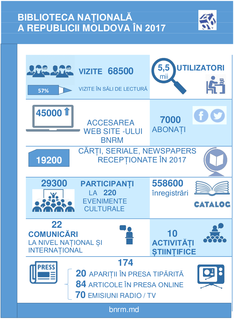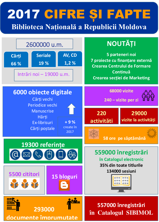 Infografice 2023 2023 2021 2021 2019 Centrul de Formare Profesională Continuă în anul 2019 2018 Biblioteca Națională în cifre 2018 Sistemul Național de Biblioteci în anul 2018 2017 Libraries and Internet in the Republic of Moldova 2017 Biblioteca Națională: cifre și fapte 2017 Biblioteca Națională în 2017