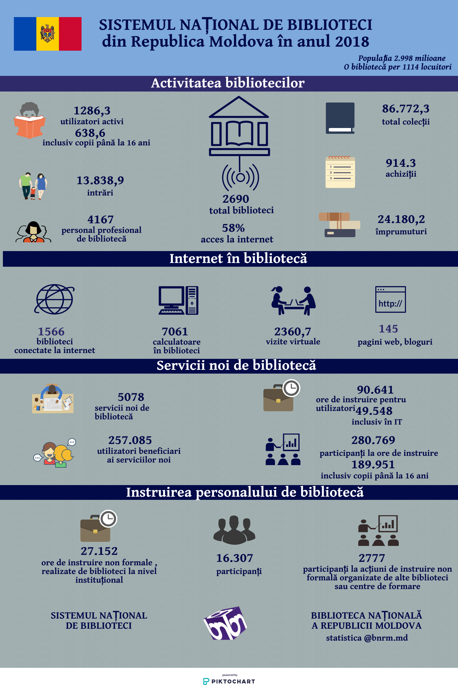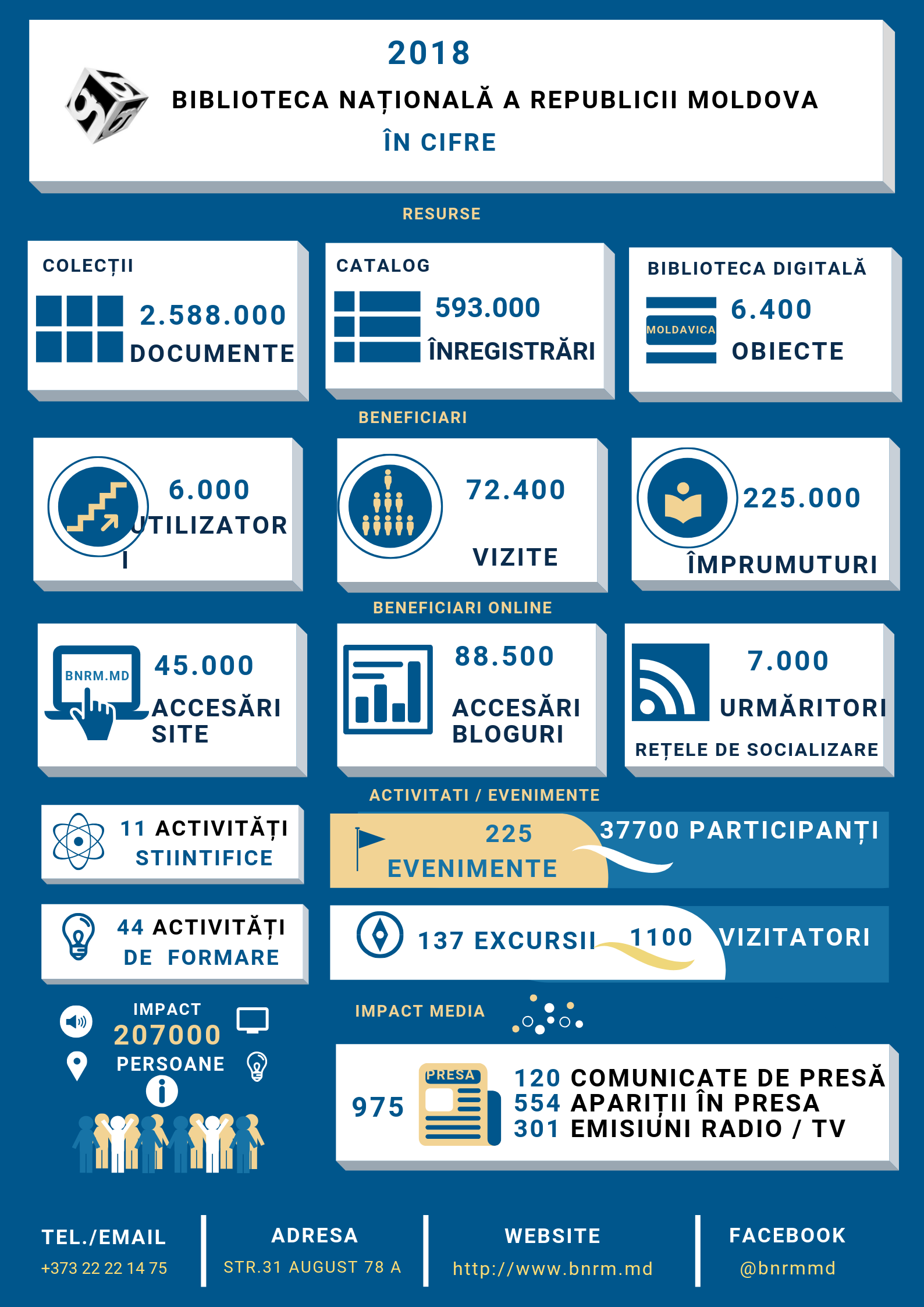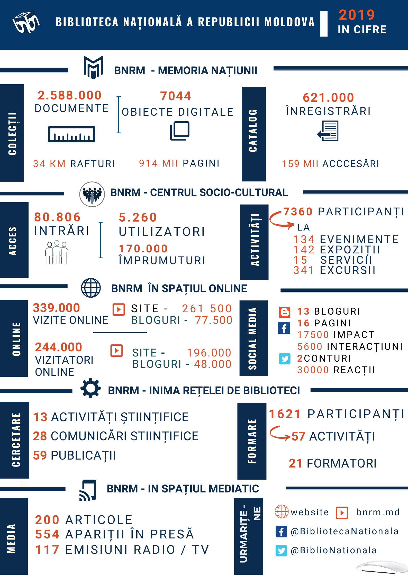 Infografice 2023 2023 2021 2021 2019 Centrul de Formare Profesională Continuă în anul 2019 2018 Biblioteca Națională în cifre 2018 Sistemul Național de Biblioteci în anul 2018 2017 Libraries and Internet in the Republic of Moldova 2017 Biblioteca Națională: cifre și fapte 2017 Biblioteca Națională în 2017