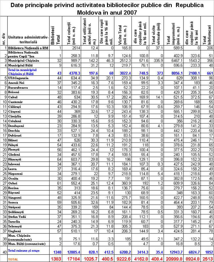 Date principale privind activitatea bibliotecilor publice din Republica Moldova în anul 2013
