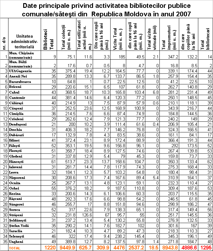 Date principale privind activitatea bibliotecilor publice comunale din Republica Moldova 2013