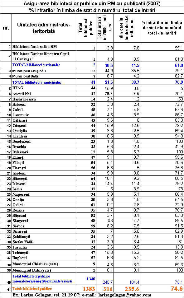 Date statistice privind activitatea bibliotecilor publice din Republica Moldova in anul 2009 (in raport cu anul 2008)